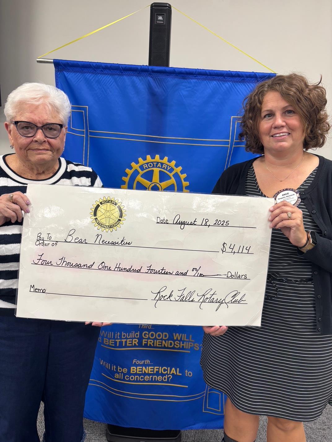 Rock Falls Rotary matched the Rotary District 6420 grant of $2057 and presented to the 501C3 Bear Necessities a check for a total of $4114 for the paper products, toiletries, and laundry products available to those monthly at United Methodist Church in Rock Falls. Accepting the check is Carol Siefken, administrator of Bear Necessities, from Angie Howard of Rock Falls Rotary Grant Committee. This grant will provide four months of donations through Bear Necessities.